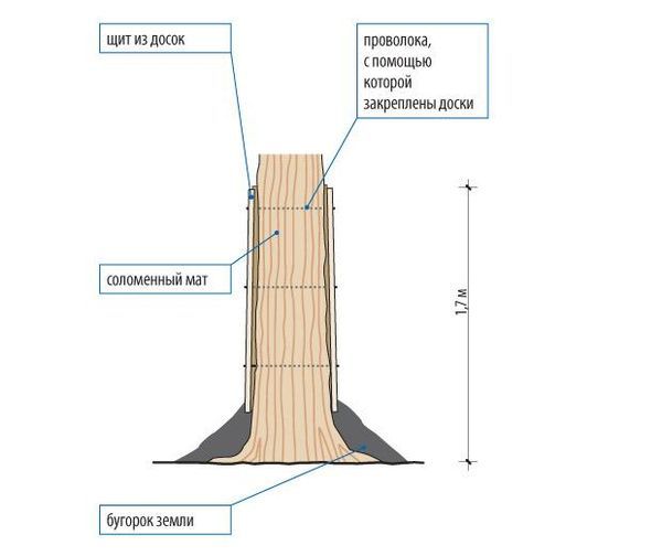 A kerti kedvencednek megfelelő menedék kiválasztásához figyelembe kell venned a regionális időjárási viszonyokat. Közép-Oroszországban a talaj mulcsozása elegendő a kedvező teleléshez. A moszkvai régióban, ahol a hőmérséklet meredeken csökkenhet, a fát a mulcsozás mellett speciális anyaggal is szigetelik. A Volga-vidéki kertészek 3 méteresre metszik a fát, és vastag fűrészpor-, szalma- vagy komposztréteggel takarják be. A törzset ezután agrospanba csomagolják.