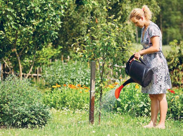 Ültetés után öntözd meg a fát két vödör vízzel. Áss egy gödröt az öntözéshez, vagy egyszerűen szegélyezd a fa törzse körüli területet egy sekély földkupaccal, hogy megakadályozd a víz túl nagy kiterjedését. Öntözés után a talaj leülepedik; ebben az esetben adj hozzá több vizet, hogy a gyökérnyak a kívánt szintre emelkedjen.