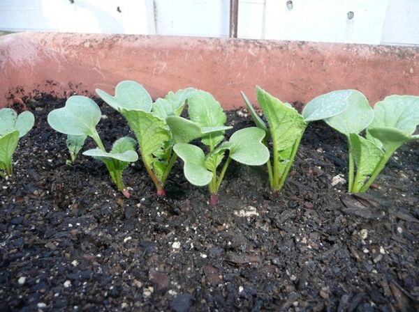 Jó, napos időben a magok már 3-4 nappal az ültetés után csírázhatnak. Amikor megjelennek az első levelek a palántákon, itt az ideje megkezdeni az ágyások ritkítását (a gyenge és sérült növények eltávolítását). A retek palánták között legalább 3-5 cm távolságot kell hagyni.