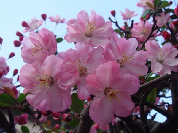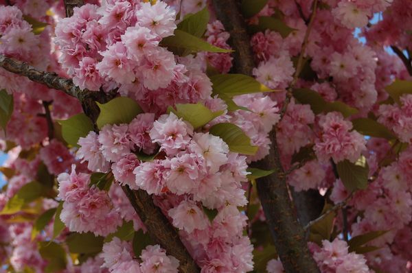 - Sakura Oshidori. Kompakt kerti fajta, 1,5–2 m magasra nőhet. A korona széles (akár 1,5 m átmérőjű). A virágzás áprilistól májusig tart. A virágok nagyok, világos rózsaszínűek, sűrűn dupla szirmokkal.