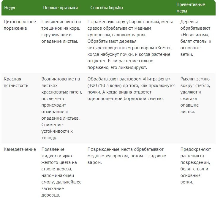 Ennek a fajtának a jelentős hátránya az alacsony betegség-ellenállósága. A Molodezhnaya vörös foltosságtól, citoszporózistól és gummosistól szenved. A fa megmentésével kapcsolatos tanácsokért lásd az alábbi táblázatot.